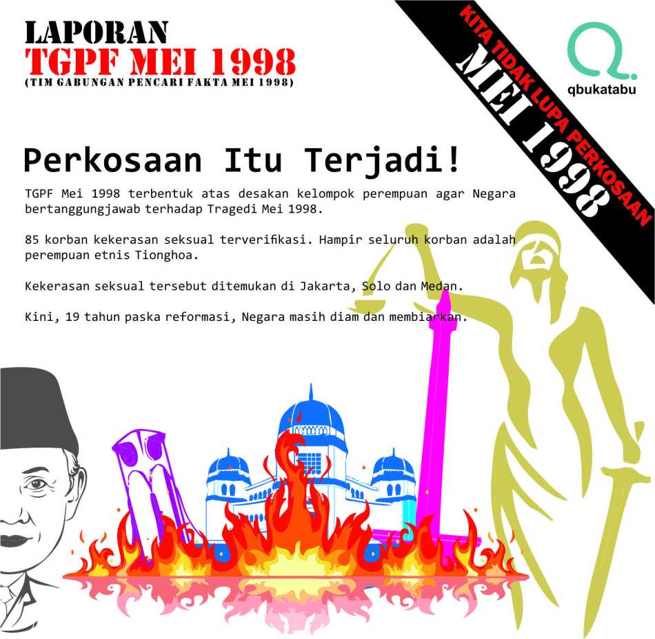 #MariIngatMei #LaporanTGPFMei1998 #TragediMei1998#KitaTidakLupaPerkosaanMei1998 #GerakBersama #KomnasPerempuan#Qbukatabu #RuangBelajarSeksualitas #FaktaSejarah #TolakLupaSejarah#PulihkanKorban #CegahKeberulangan #DukungKorban#KekerasanSeksualBukanLelucon