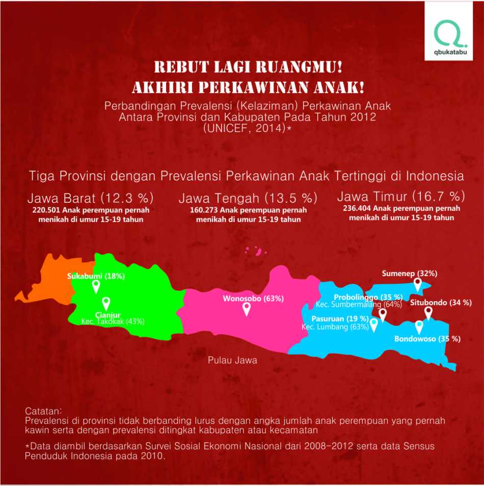 Prevalensi perkawinan anak bukan satu-satunya indikator, namun dapat dilihat dari jumlah anak perempuan yang pernah kawin pada tahun tertentu. Meskipun Jawa Timur (16,7%), Jawa Tengah (13,5%) dan Jawa Barat (12,3%) memiliki prevalensi yang rendah dibandingkan prevalensi nasional, namun jumlah anak perempuan yang pernah kawin di tahun 2012 merupakan yang tertinggi.
