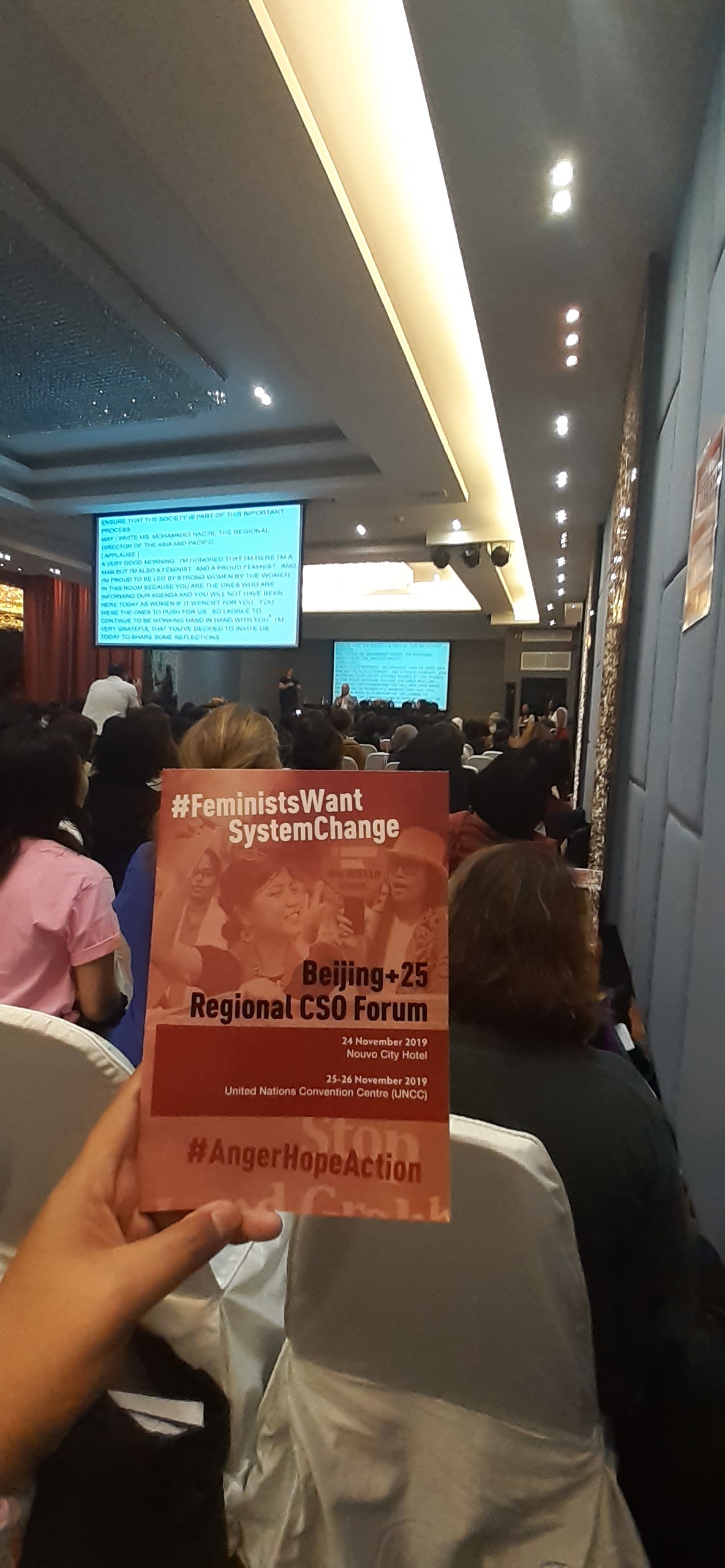 Forum Masyarakat Sipil Regional Asia dan Pasifik Beijing+25 (24-26 November 2019). Kegiatan ini terlaksana sagera setelah Forum Feminis Muda berakhir. Kegiatan ini diikuti lebih dari 230 organisasi masyarakat sipil, termasuk pembela hak asasi manusia dan aktivis akar rumput dari Asia dan Pasifik berkumpul dalam pertemuan ini. Forum CSO Region Asia dan Pasifik berfungsi mengonsolidasikan masukan masyarakat sipil dalam proses review di level regional dan global yang akan ditindaklanjuti di CSW64 pada Maret 2020 di New York. Kegiatan ini berkelanjutan dari Forum Feminis Muda, dokumen call-for-action disampaikan kawan muda dari Nepal dan Kepulauan Solomon di acara pembukaan Forum CSO.