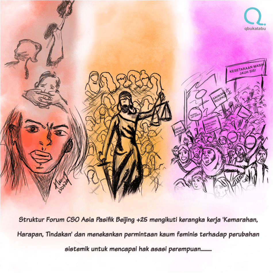 Seorang panitia pengarah Forum CSO Regional Asia dan Pasifik menyampaikan bahwa pertemuan ini merupakan ruang feminis yang inklusif karena beragam suara perempuan dari seluruh Asia dan Pasifik didengar, diakui, dan divalidasi. Struktur Forum CSO Asia Pasifik Beijing +25 mengikuti kerangka kerja ‘Kemarahan, Harapan, Tindakan’ dan menekankan permintaan kelompok feminis terhadap perubahan sistemik untuk mencapai hak asasi perempuan. Di hari kedua pelaksanaan forum, Qbukatabu menjadi salah satu narasumber dalam diskusi panel tentang Bridging Generations for Feminist Collaborations: Dialogue and Action Planning & Intergenerational Dialogue – The Future of Feminisms. Dalam diskusi ini, Qbukatabu memaparkan cara untuk menjembatani gap yang muncul dalam gerakan perempuan pada masa sekarang dan di masa lalu.