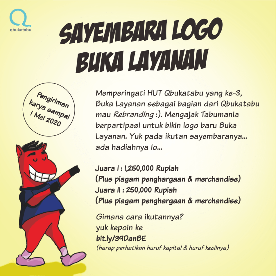 Dalam rangka ulang tahun ke-3 Qbukatabu, Buka Layanan sedang dalam proses rebranding (branding ulang). Salah satu bagian yang paling penting dalam rebranding adalah logo. Kami ingin mengajak Tabumania berpartisipasi dalam membuat logo tersebut dalam Sayembara Logo Buka Layanan.