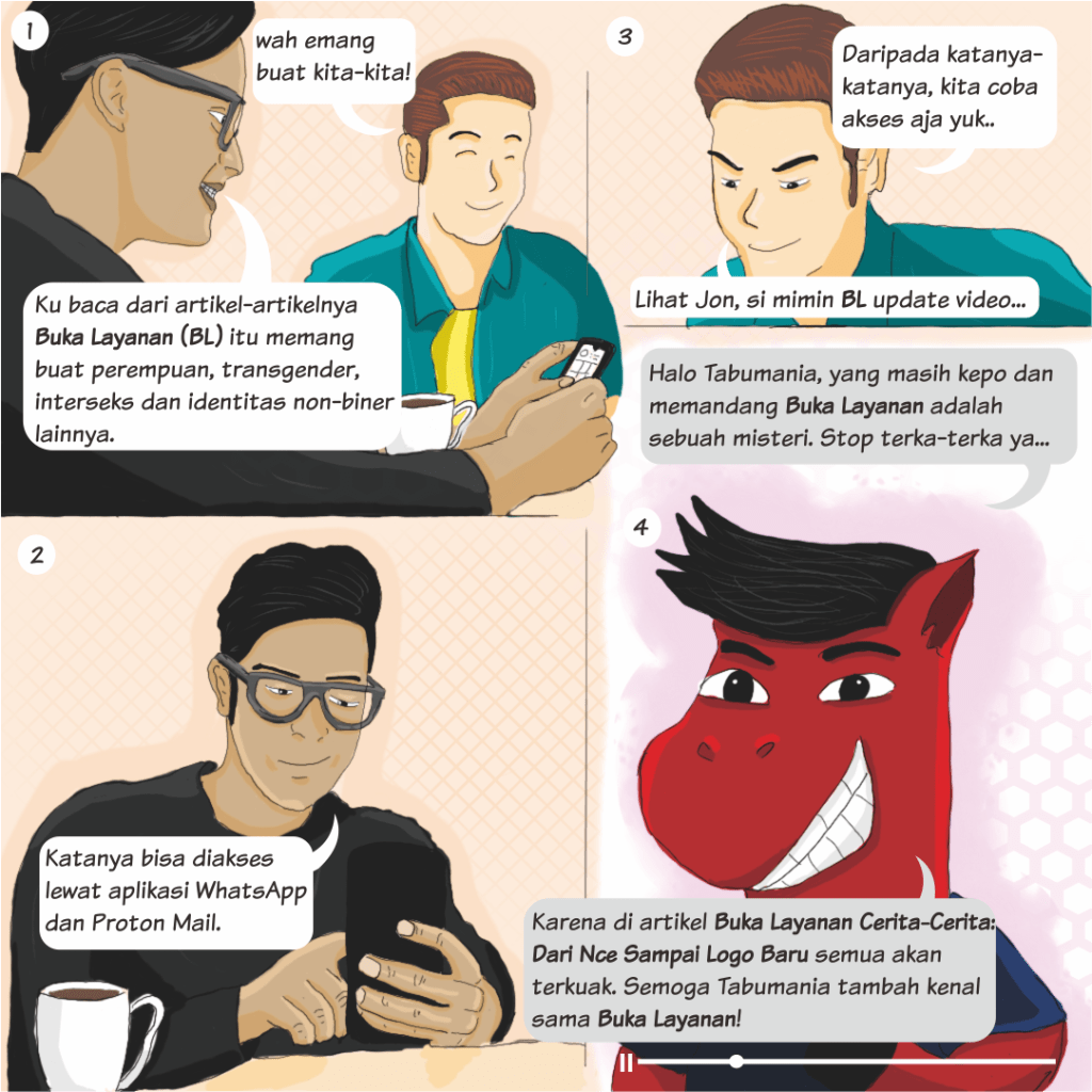 Gitu deh cerita dari Buka Layanan, dengan keluarnya tulisan ini, kami dari Buka Layanan secara resmi mengumumkan pergantian logo Buka Layanan. Buat Tabumania yang mau cerita, curhat, konseling atau nanya-nanya ke Buka Layanan, cus akses Buka Layanan! Semoga Buka Layanan bisa terus jadi teman cerita yang inklusif, hangat dan menyimpan cerita Tabumania jadi rahasia kita berdua. (RR)