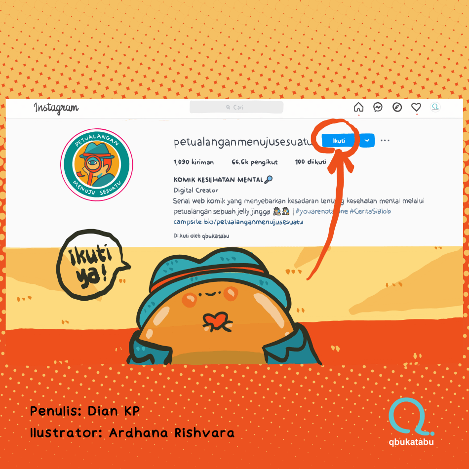 Tabumania, keberadaan @petualanganmenujusesuatu menjadikan pembahasan isu kesehatan mental dengan cara yang menarik. Bentuk Blob yang lucu menggemaskan dan warna yang cerah tidak membosankan untuk selalu dinanti cerita setiap harinya. Tidak hanya memberikan pencerahan tentang isu kesehatan mental, tetapi juga membuat orang merasa tidak sendiri untuk membicarakan permasalahannya terkait kesehatan mental. Nah, Tabumania juga mengikuti komik @petualanganmenujusesuatu atau tidak? Bagaimana menurut kalian?